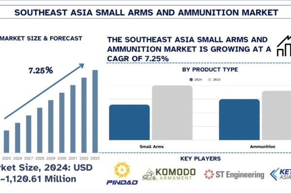 The Southeast Asia Small Arms and Ammunition Market was valued at ~USD 1,120.61 million in 2024 and is expected to grow at a strong CAGR of approximately 7.25% during the forecast period (2025-2033F), The Southeast Asia Small Arms and Ammunition Market is characterized by other manufacturers that integrate local production capacity, military-grade engineering, and long-term…