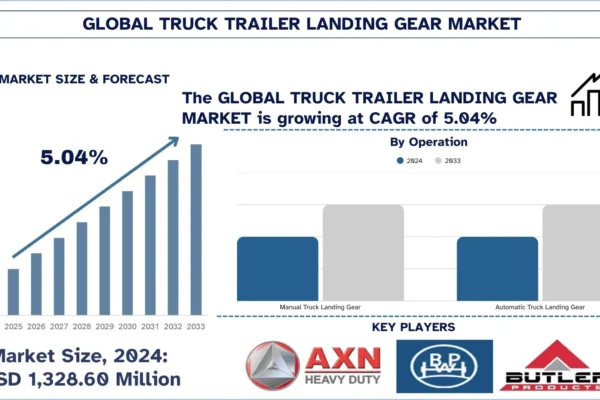 The Global Truck Trailer Landing Gear Market was valued at USD 1,328.60 million in 2024 and is expected to grow at a steady CAGR of approximately 5.04% over the forecast period (2025-2033F), Growing trailer builds, fleet modernization, and higher freight-handling intensity are increasing demand for durable, high-capacity landing gear systems. Based on operation, manual landing…