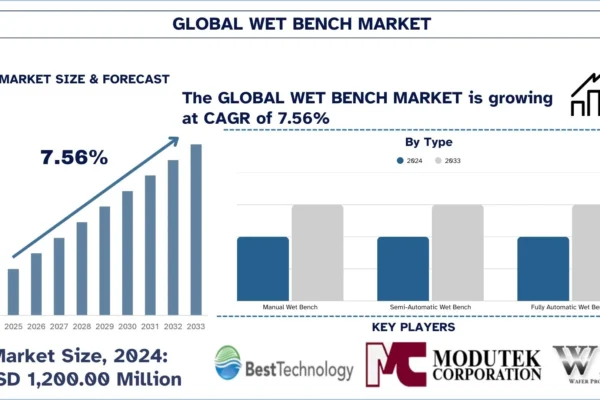 The Global Wet Bench Market was valued at USD 1,200.00 million in 2024 and is expected to grow at a steady CAGR of approximately 7.56% over the forecast period (2025-2033F), The wet bench market enjoys heightened awareness of contamination-control among the semiconductor, electronics, and precision-manufacturing players, regardless of size. Fabricators are also becoming aware of…